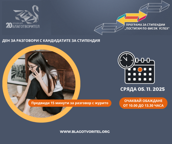 В сряда, 5 ноември, Фондация „Благотворител“ ще проведе телефонните интервюта с кандидатите за стипендия по програма „Постигам по-висок успех“.