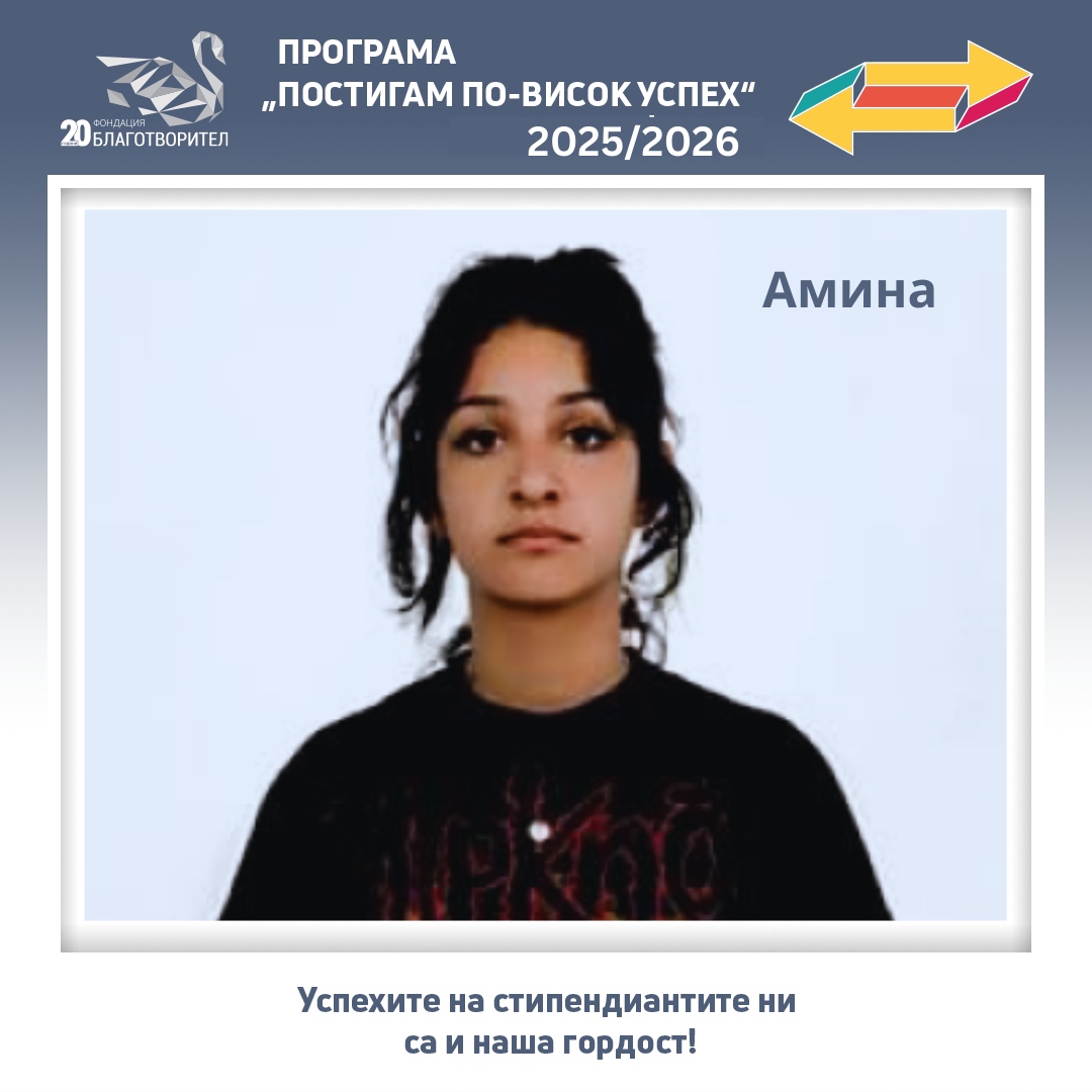 Амина Семерджиева е на 16 г., 10-ти клас, от гр. Пловдив. За първи път е стипендиант по програма “Постигам по-висок успех” на Фондация “Благотворител“. Общият