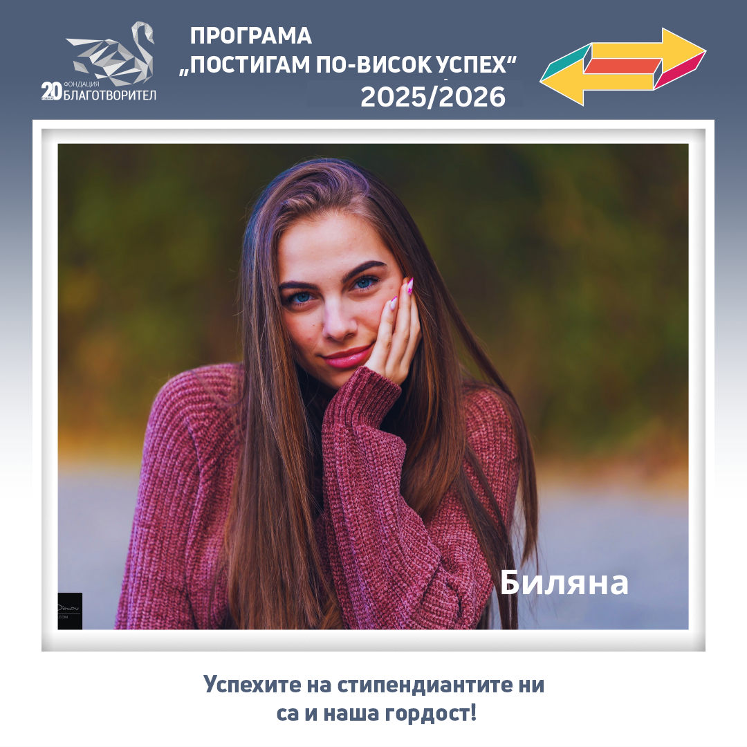 Биляна Тодорова е на 17 г., 10 клас, от гр. Стара Загора. За четвърти път е стипендиант по програма “Постигам по-висок успех” на Фондация “Благотворител“.