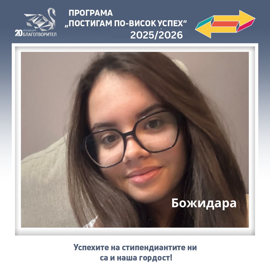 Божидара Гаджева е на 16 г., 10-ти клас, от гр. Пловдив. За втори път е стипендиант по програма “Постигам по-висок успех” на Фондация “Благотворител“. Общият