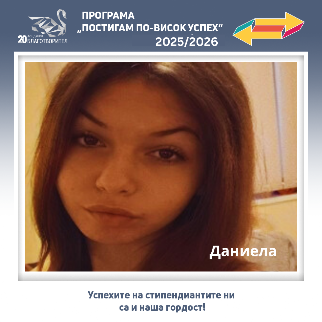 Даниела Хаджийска е на 18 г., 12 клас, от гр. Пловдив. За трети път е стипендиант по програма “Постигам по-висок успех” на Фондация “Благотворител“. Общият