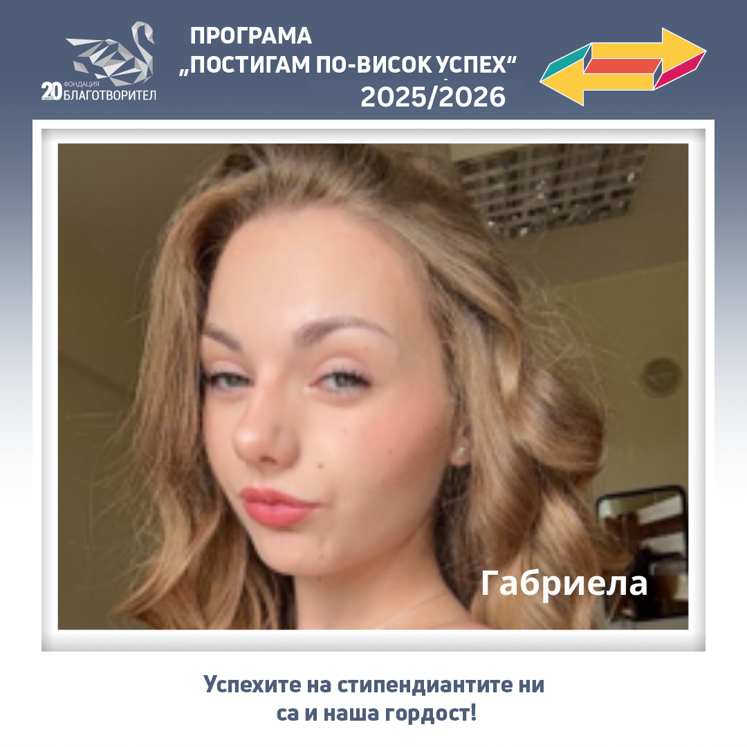 Габриела Иванова е на 17 г., 11 клас, от гр. Свищов. За трети път е стипендиант по програма “Постигам по-висок успех” на Фондация “Благотворител“. Общият