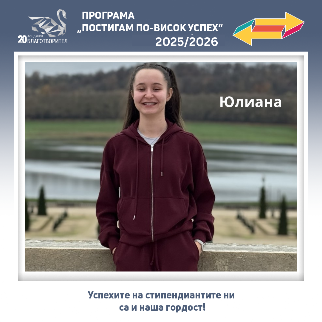 Юлиана Спасова е на 18 г., 12 клас, от гр. София. За трети път е стипендиант по програма “Постигам по-висок успех” на Фондация “Благотворител“. Учи