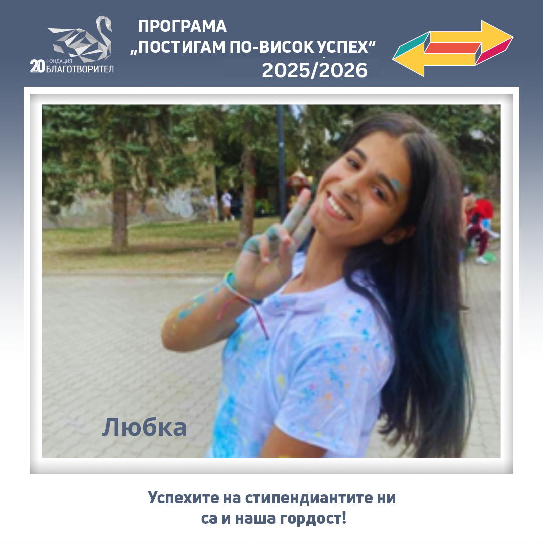 Любка Бакалова е на 15 г., 9 клас, от гр. Велико Търново. За първи път е стипендиант по програма “Постигам по-висок успех” на Фондация “Благотворител“.