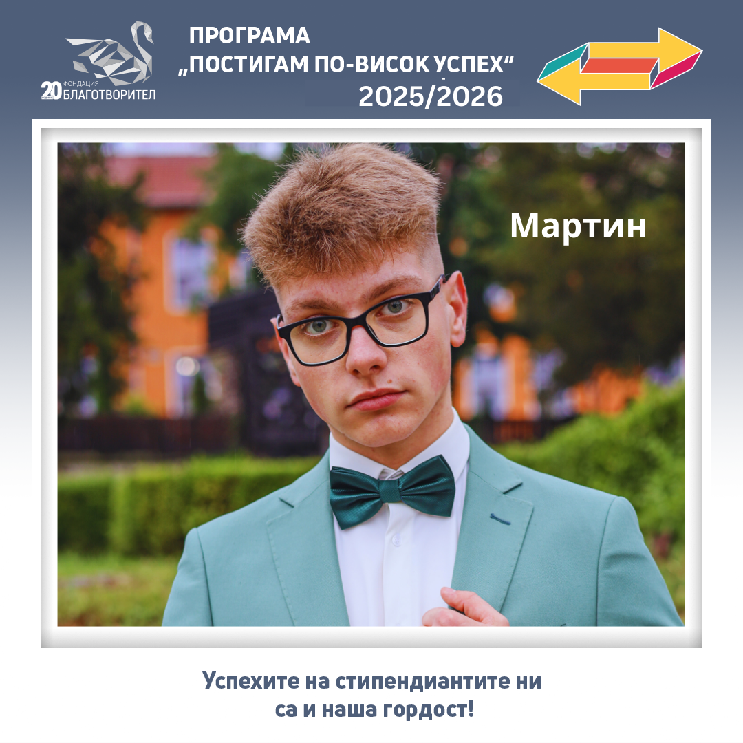 Никола Александров е на 17 г., 11 клас, от гр. Търговище. За първи път е стипендиант по програма “Постигам по-висок успех” на Фондация “Благотворител“. Общият