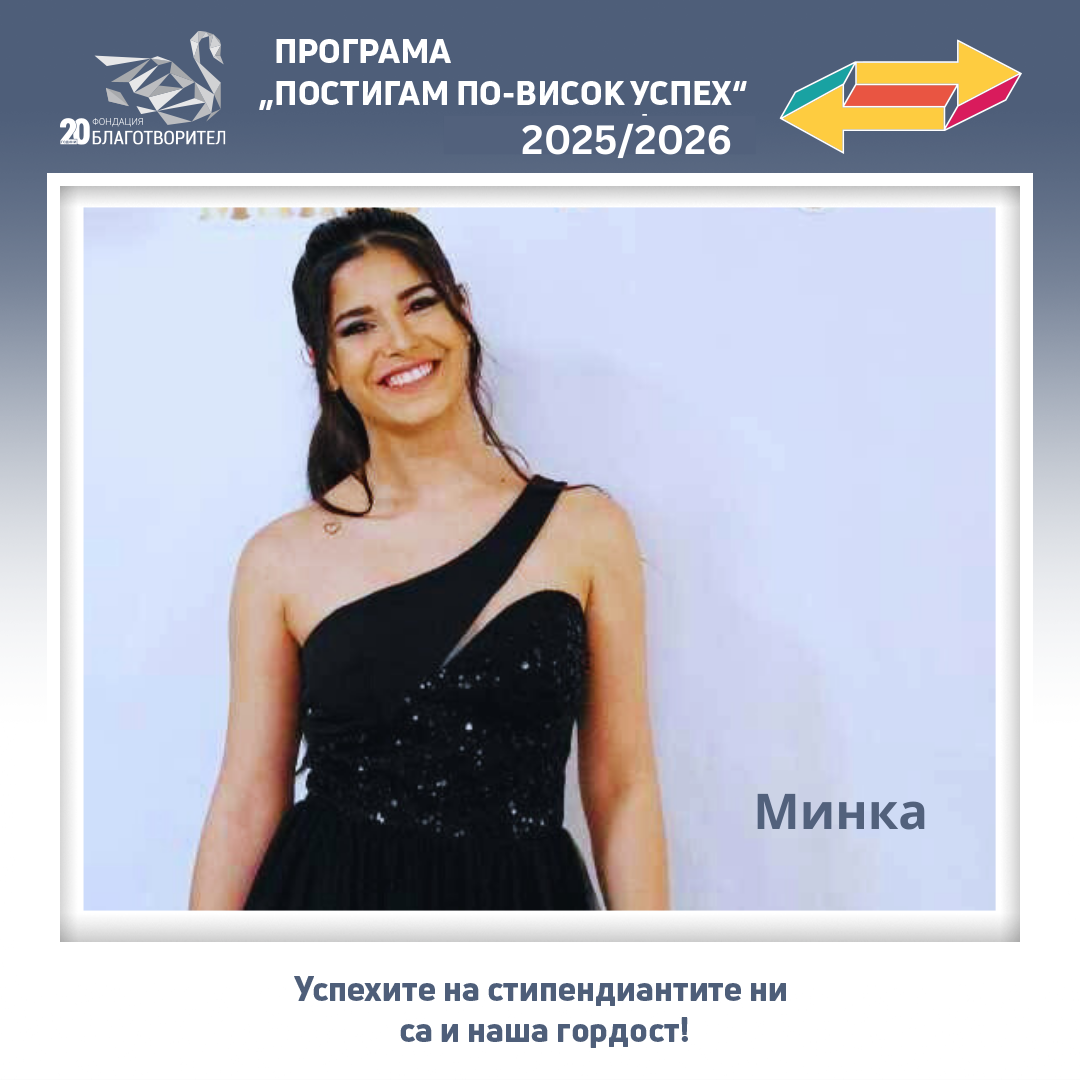 Станислава Костова е на 17 г., 11 клас, от гр. Ямбол. За втори път е стипендиант по програма “Постигам по-висок успех” на Фондация “Благотворител“. Общият