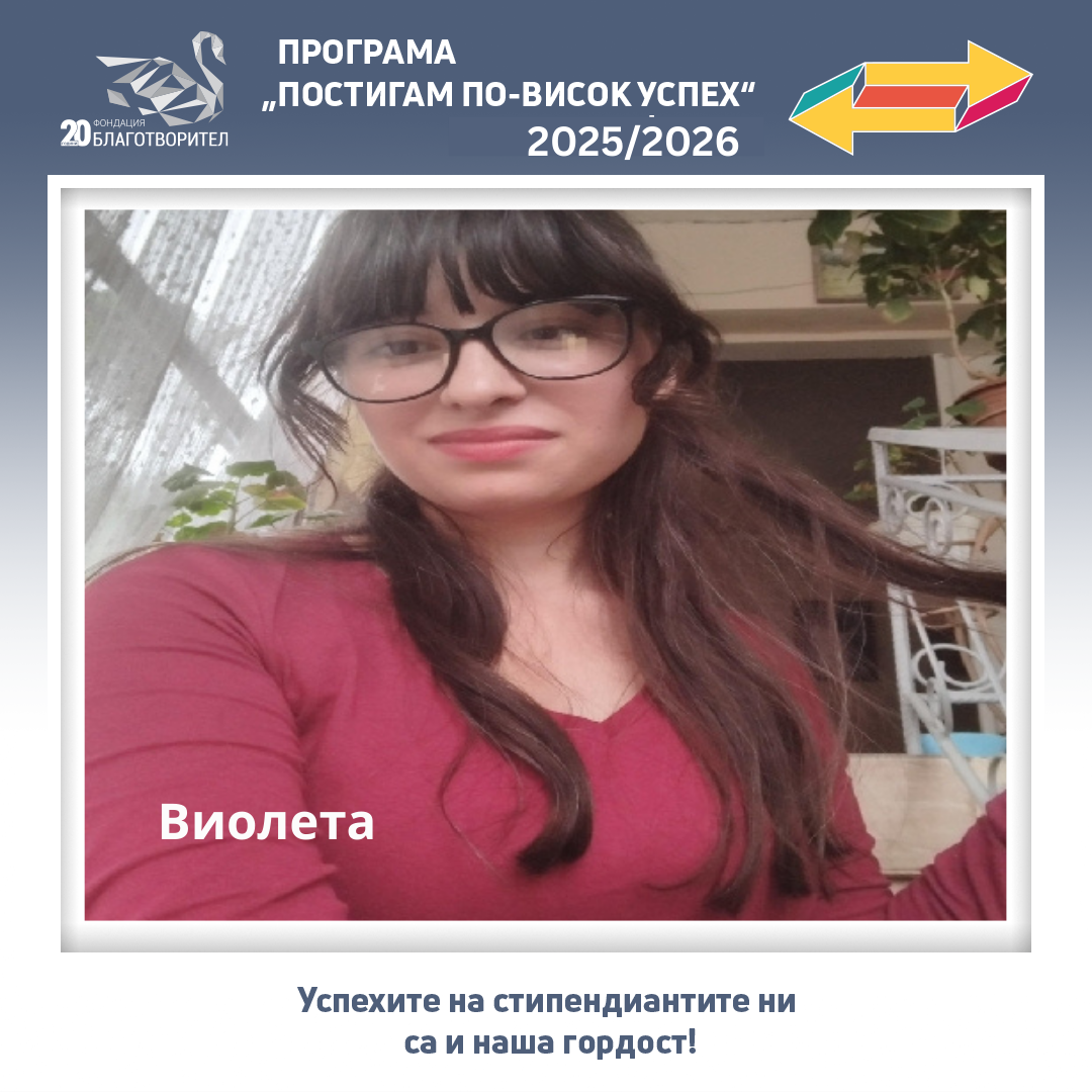 Виолета Йоргова е на 19 г., студент първи курс в Шуменски Университет “Епископ Константин Преславски”, специалност “Социални дейности”. Общият успех от дипломата й за средно
