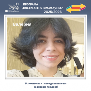 Валерия Василева е на 18 г., 12-ти клас, от гр. София. За трети път е стипендиант по програма “Постигам по-висок успех” на Фондация “Благотворител“. Общият й успех от предходната учебна година е отличен 5.95.