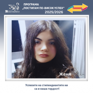 Женя Лисичкова е на 17 г., 11-ти клас, от гр. Бургас. За първи път е стипендиант по програма “Постигам по-висок успех” на Фондация “Благотворител“. Общият й успех от предходната учебна година е отличен 5.56.